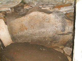 Dieser mit Ornamenten verzierte Stein steht in einem Hügelgrab in der Bergkette "Sliabh na Caillighe" (gael. Berg der Hexe). Über 30 zum Teil unausgegrabene Ganggräber von der gleichen Art wie die Boyne Tal Gräber befinden sich hier. Die Gräber von Loughcrew, wie der Ort auch genannt wird, verteilen sich auf zwei Hügeln. Sie werden auf die 2. Hälfte des 3. Jt. v. Christus datiert. Ein Gang dorthin lohnt sich, weil einem Teil der Gräber die Kuppen fehlen und man so die freigelegten Gänge und Kammern gut sehen kann. Das Land rund um die Gräber dient als Pferde- und Schafweiden. |