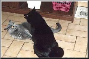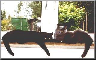 Hallo, wir sind aus dem Hause der Britisch Kurzhaar und wurden am 30. März 1995 in Kassel (nahe der Karlsaue, wie unser Zwinger-Name schon erahnen läßt) geboren. Wir waren fünf Geschwister, zwei graue und drei schwarze.